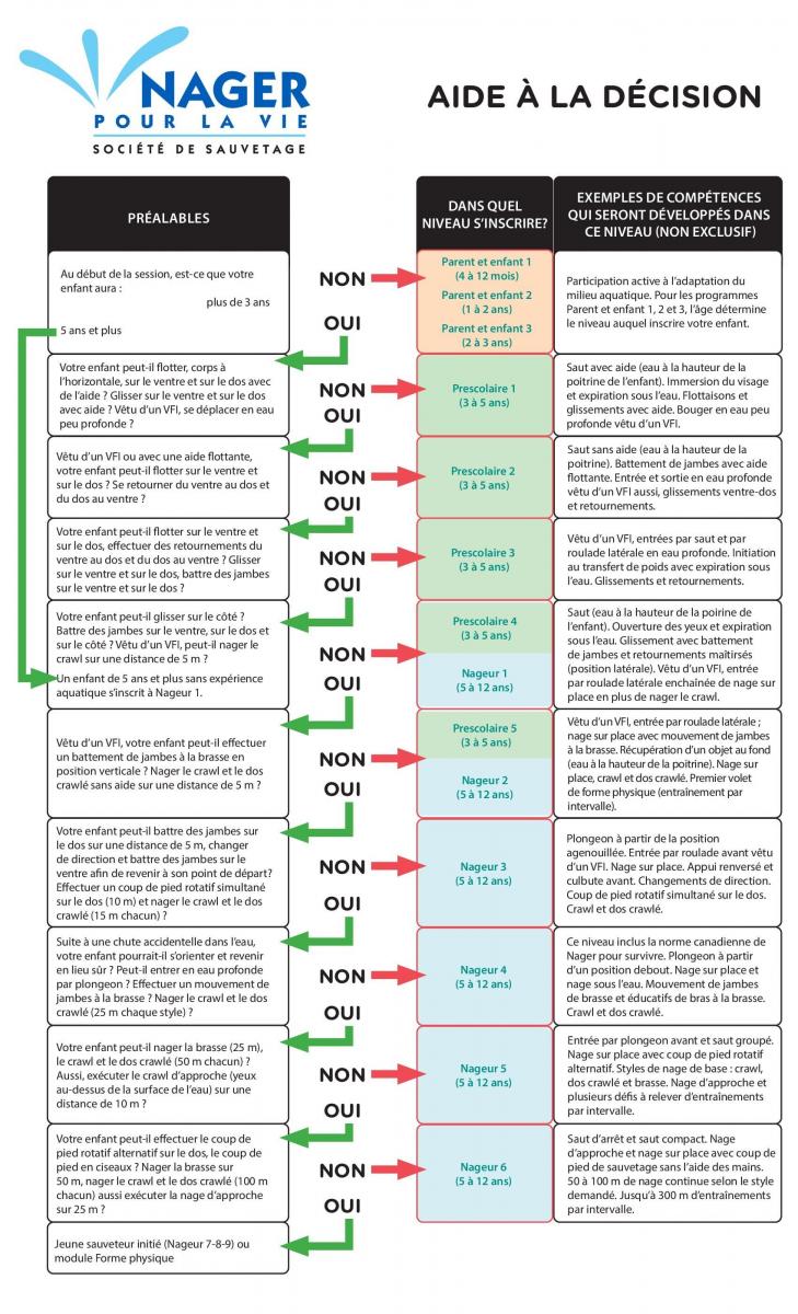 Les enfants d’âge préscolaire progressent du module Préscolaire à celui de Nageur d’après leur âge, et ce, habituellement vers 5 ou 6 ans. À cet âge, si l’enfant a complété le niveau Préscolaire 1 ou 2, il passera à Nageur 1; s’il a complété le niveau Préscolaire 3, 4 ou 5, il passera à Nageur 2.