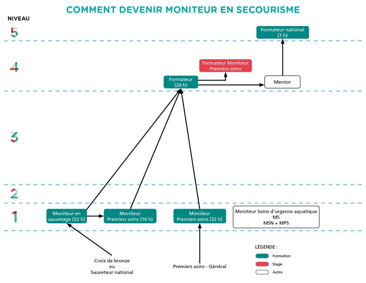 Pour devenir Moniteur de premiers soins, les candidats peuvent suivre une formation initiale de 32 h. S’il détient déjà un brevet de moniteur en sauvetage de la Société de sauvetage, cette formation sera d’une durée de 16h.